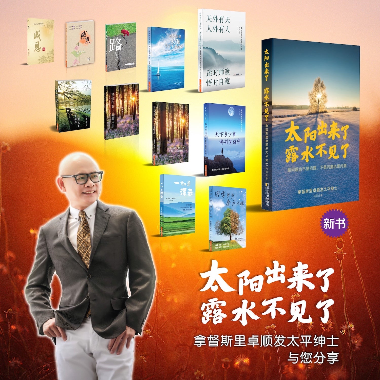 《太阳出来了,露水不见了》是卓顺发太平绅士的第11本著作,是其多年慈悲行愿、生命体悟与社会实践的又一次温暖凝萃。在这本书的意象里,朝阳破晓象征光明、希望与觉悟的来临;露水的消逝,则象征烦恼的化解、忧虑的释怀,以及在生命的暖流中重新踏出坚实一步的勇气。正如卓主席一贯所强调的,人生的道路或许曲折,但只要愿意迎向光明,所有阴影终将化为成长的土壤。